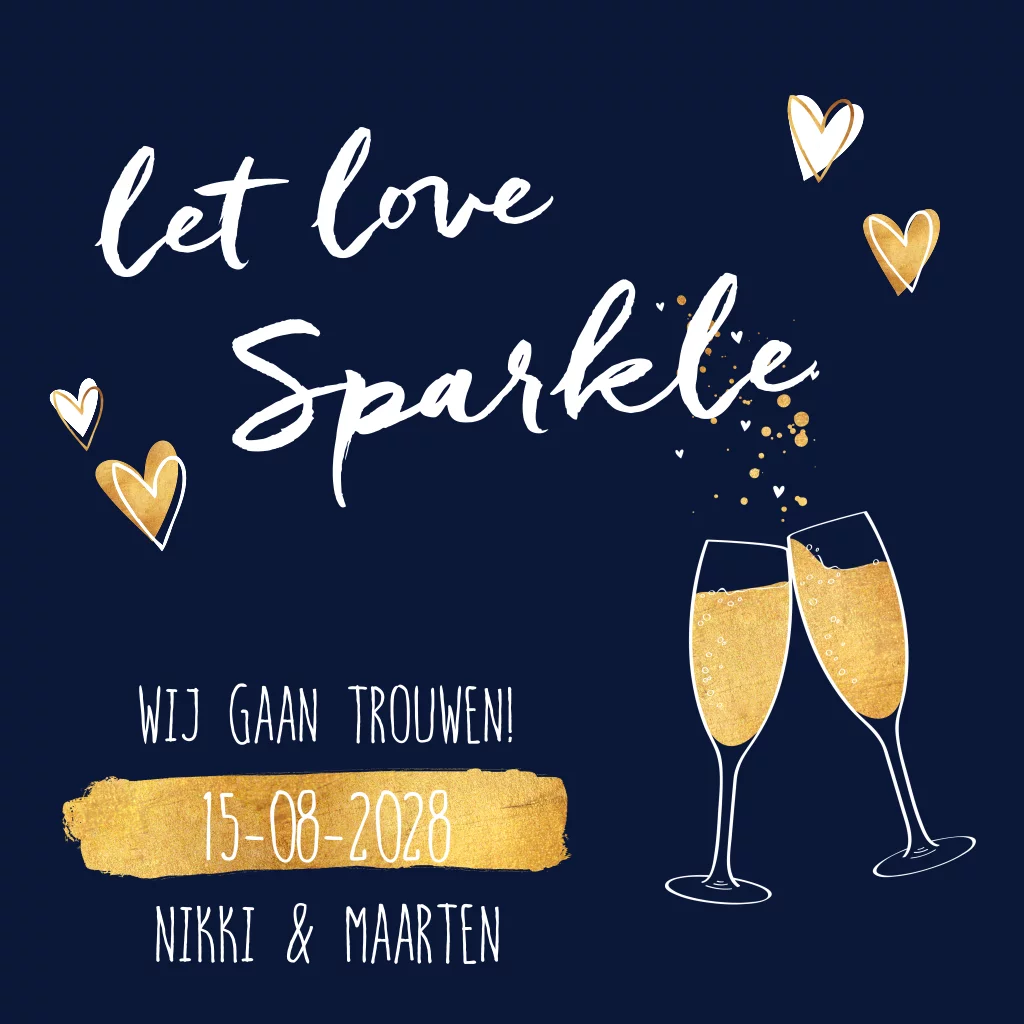 Let love sparkle! Donkerblauwe trouwkaart met goudkleurige champagneglazen en hartjes. Pas de tekst geheel naar wens aan. Leuk met een goudkleurige envelop en bijpassende sluitzegel.
