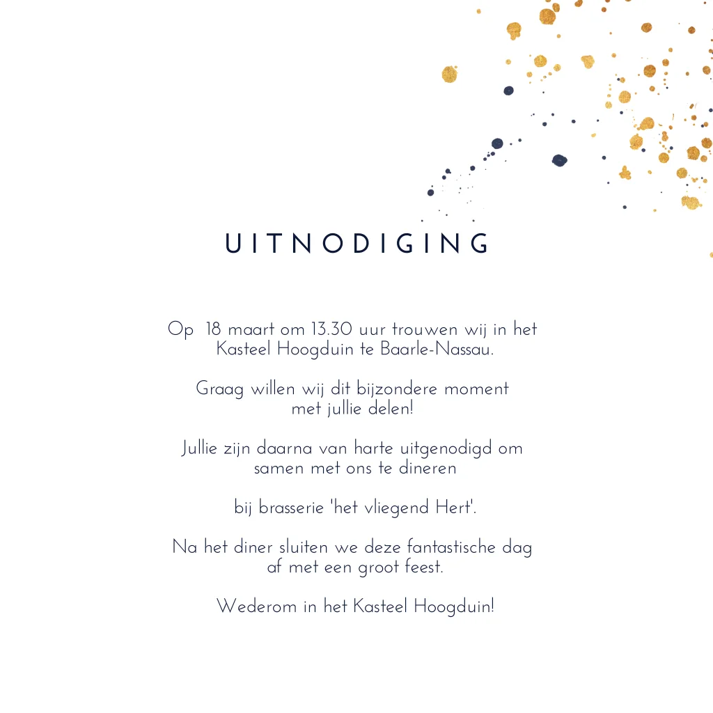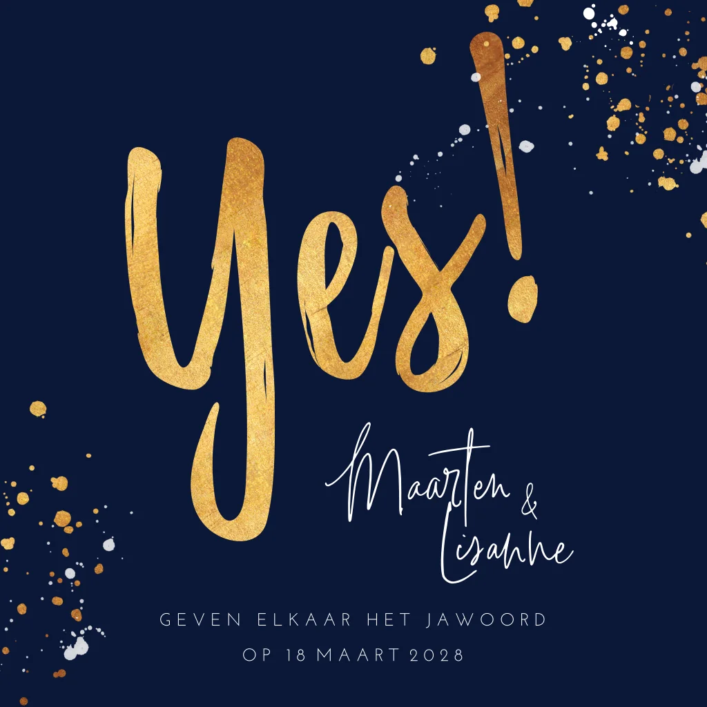 Stijlvolle trouwkaart voor jullie trouwdag met YES in goudkleur en inktspetters. Let op; dit is grafisch goud en geen goudfolie of gouden inkt.