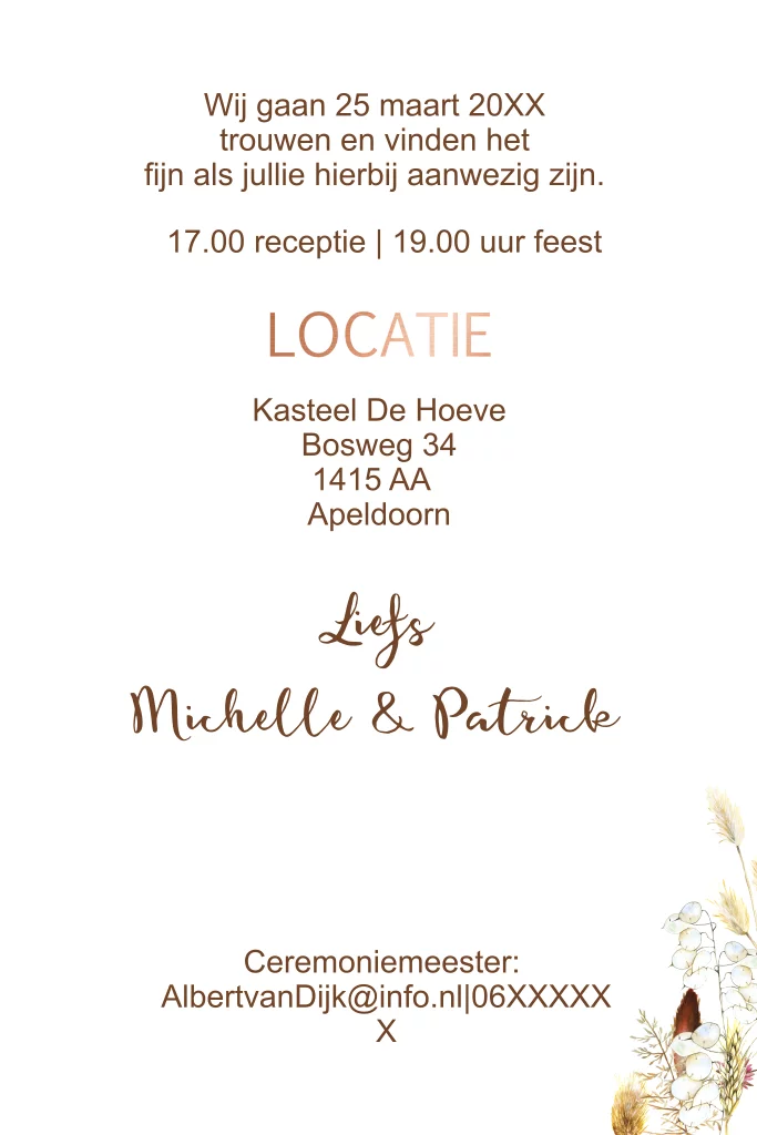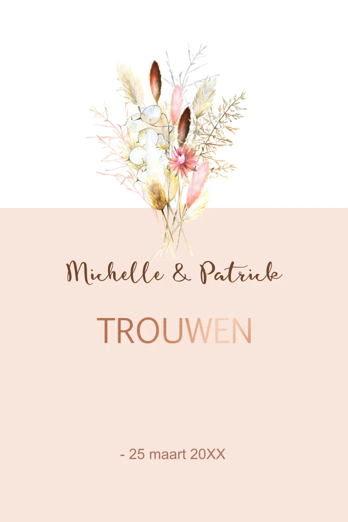 Jullie bruiloft komt er aan! Kies voor deze prachtige trouwkaart met droogbloemen. Deze kaart past er mooi met een parelmoeren envelop. Maak het helemaal compleet met een sluitzegel.