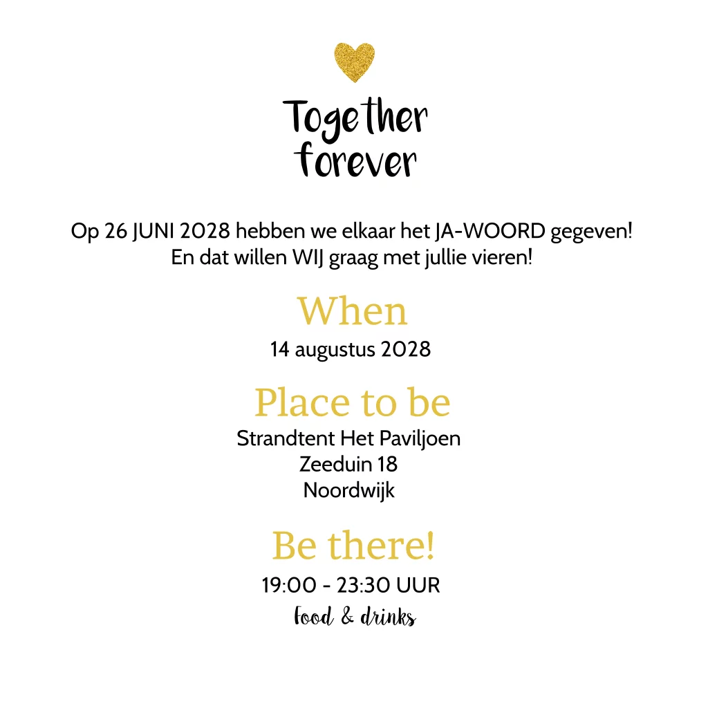 Deze feestelijke trouwkaart met foto aam de binnenkant wordt extra vrolijk gemaakt door de toevoeging van de gouden letters. Maak het feest helemaal af door een gouden envelop te kiezen.