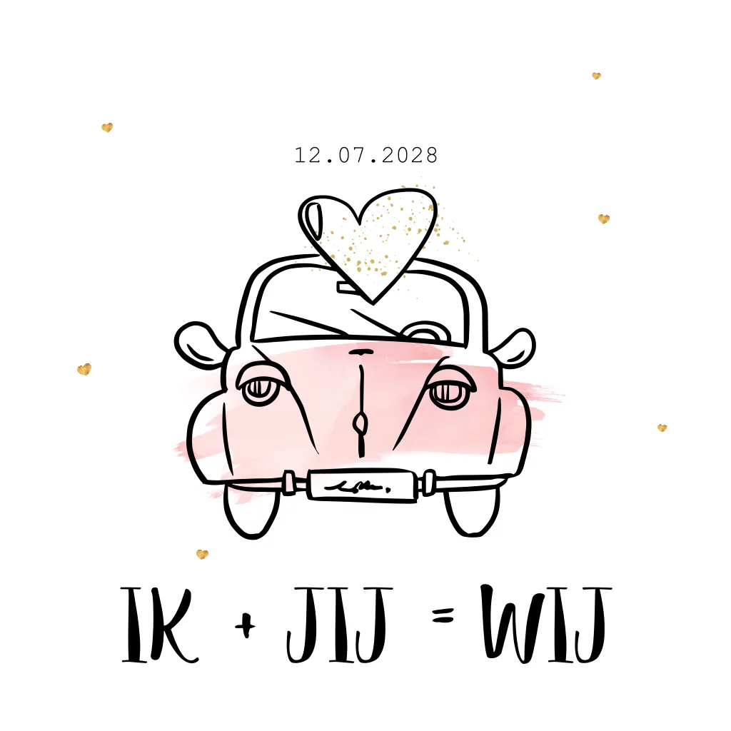 Ik en jij = wij! Vrolijk geïllustreerde trouwkaart met auto, roze watercolour elementen en grafisch gouden details. Maak de trouwkaart helemaal compleet met een bijpassende keur envelop en sluitzegel.