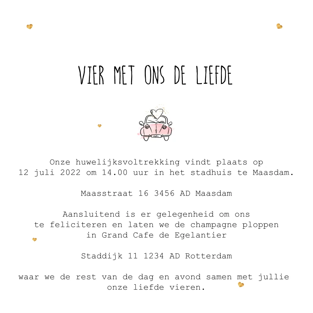Trouwkaart met geïllustreerde auto en hartjes