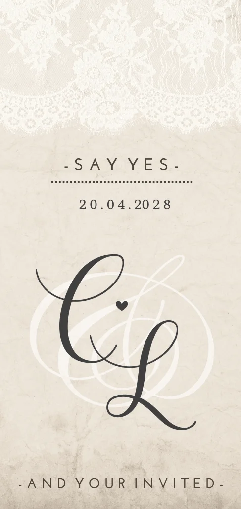 Klassieke trouwkaart met kant, zandkleurige achtergrond en sierlijke letters. De tekst op de kaart is geheel naar wens aan te passen. Deze kaart past goed bij onze zand envelop.