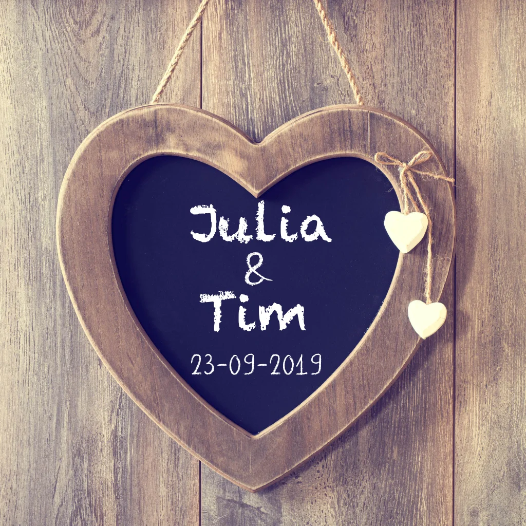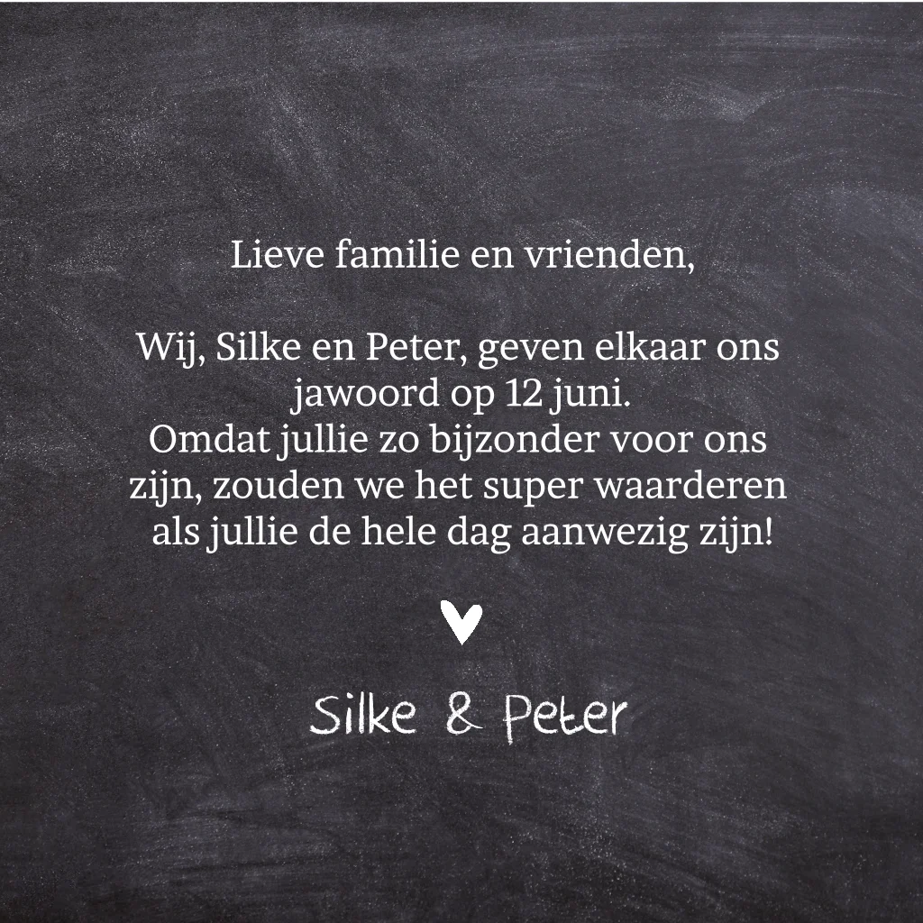 Maak deze mooie uitnodiging voor jullie trouwfeest. Met hartje van krijtbord op mooie houten achtergrond. Deze trouwkaart past leuk bij een kraft envelop!