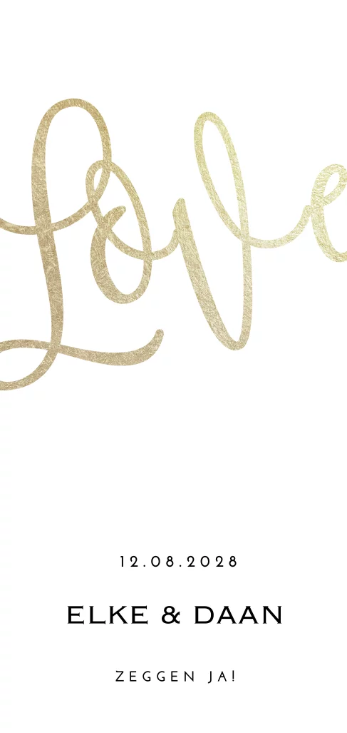 Trouwkaart met LOVE als eyecatcher van de kaart. In mooi goudlook een sierlijke letters. Druk deze langwerpige trouwkaart af op parelmoer papier. Dat geeft een mooie glans aan de kaart.