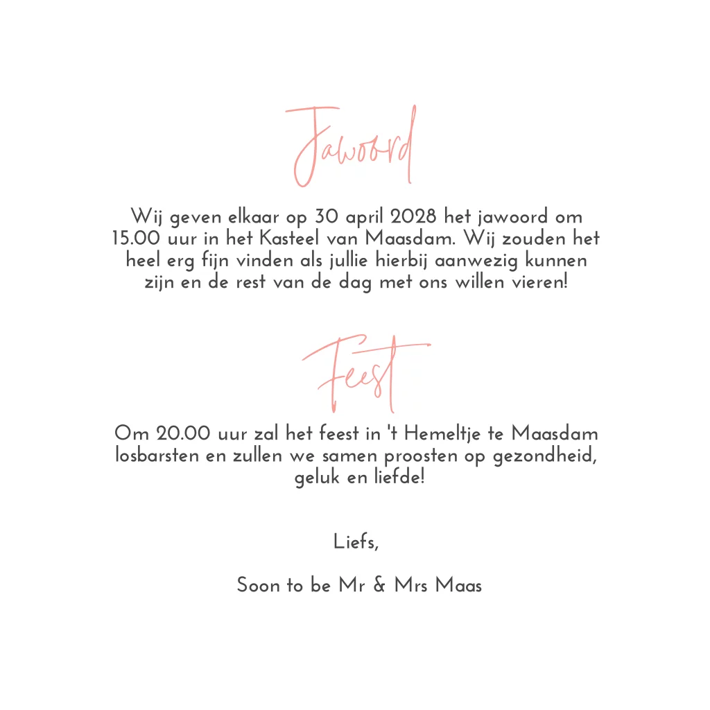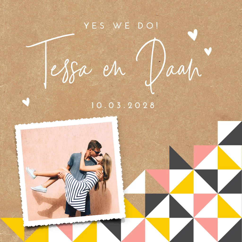 Trouwkaart met foto op een krafpapieren look achtergrond en vrolijk gekleurde geometrische vormen. De lieve hartjes maken deze trouwuitnodiging compleet.