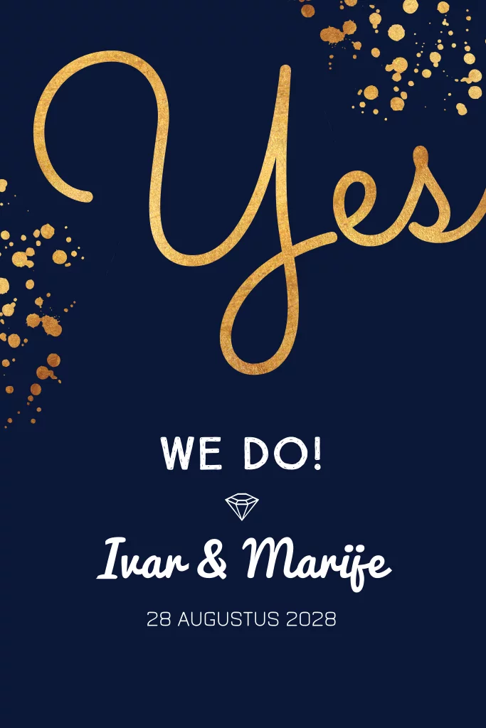 Stijlvolle trouwkaart met donkerblauwe achtergrond en goudkleurige tekst Yes. De achterkant van deze trouwkaart bevat leuke icoontjes waarmee je op een leuke wijze jullie dagindeling kunt delen met de gasten.