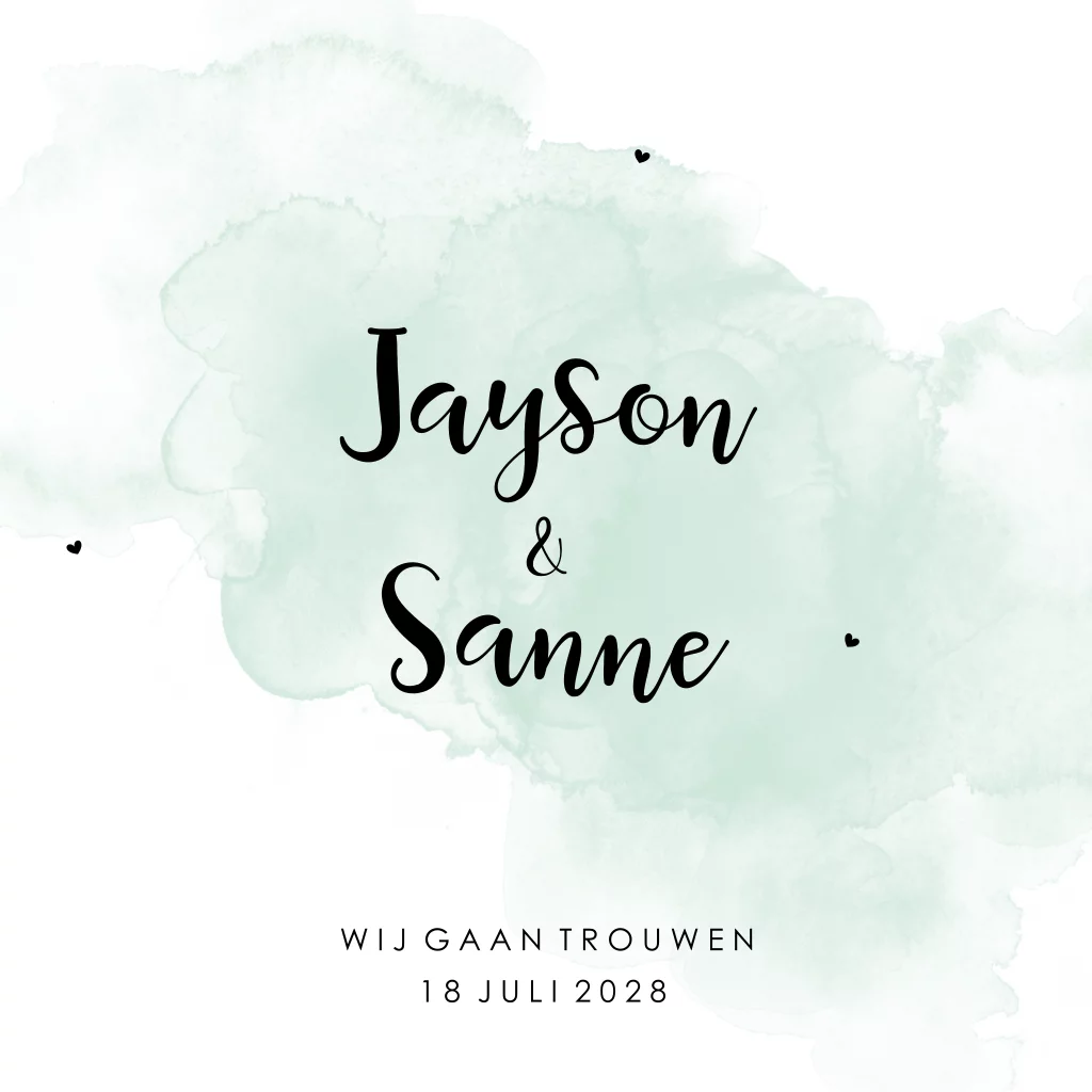 Romantische trouwkaart met mintgroene aquarel achtergrond. In deze watercolor wolk komen jullie namen mooi uit. Op de achterkant vind je leuke icoontjes die jullie speciale dag weergeven. Deze kaart past mooi bij onze mintgroene envelop.