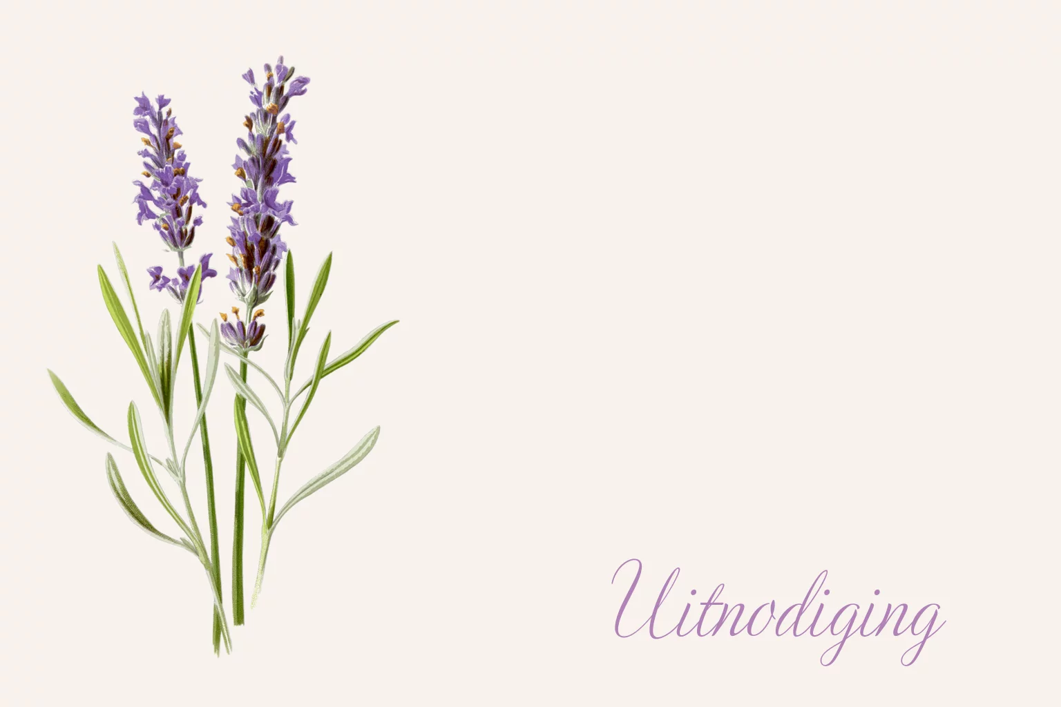 Liggende, dubbele trouwkaart met takje lavendel op de voorkant. De teksten zijn uiteraard naar wens aan te passen!