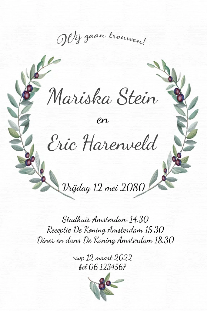 Prachtige tijdloze trouwkaart met olijftakken in groen.