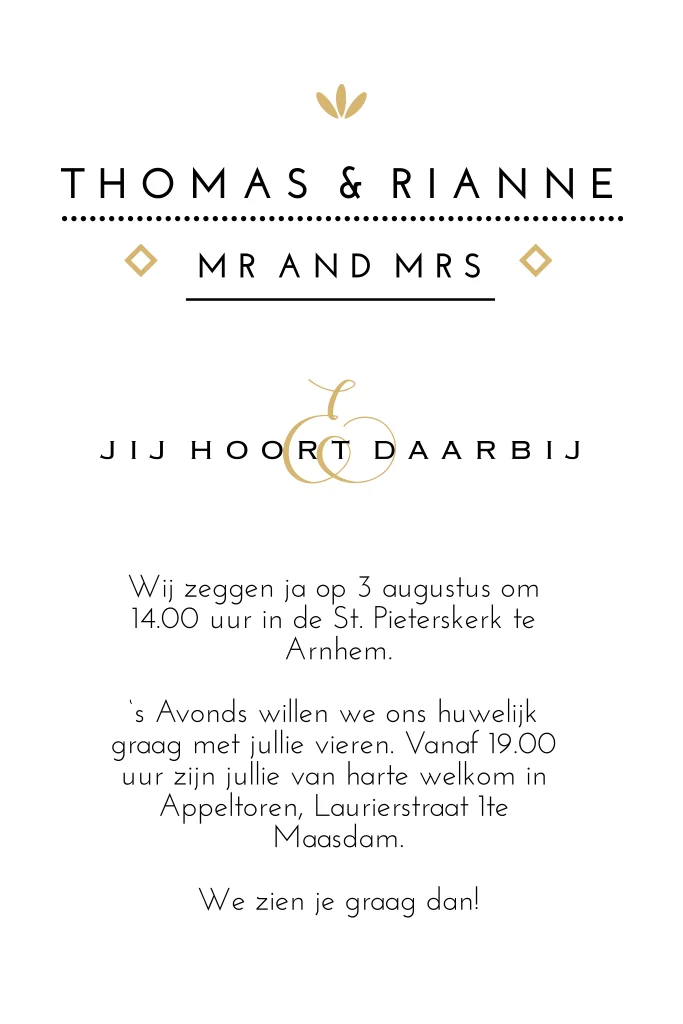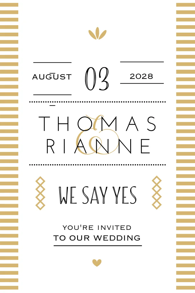 Strakke trouwkaart met stijlvolle goudlook elementen. Zoals lijnen, ruitjes en hartje. Druk deze kaart af op parelmoer papier. Dat geeft een mooie glans aan de kaart. Mooi met een bijpassende envelop en sluitzegel.