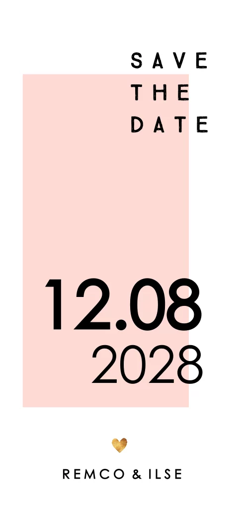 Strakke moderne trouwkaart met roze vlak en goudlook hartje. Het roze vlak kun je geheel naar wens aanpassen. Dus kies voor een kleur dat bij jullie past. Leuk ook om de envelop aan die kleur aan te passen.
