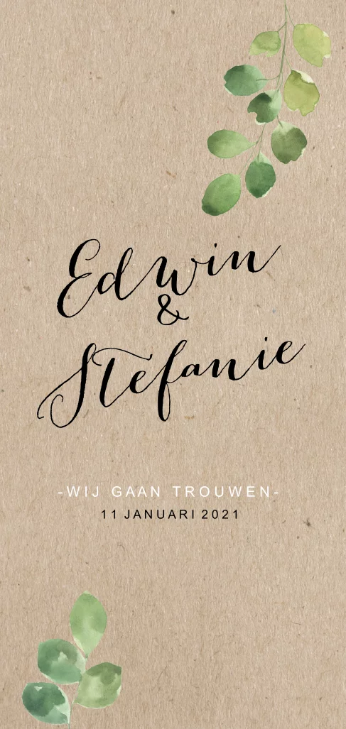 Hippe langwerpige trouwkaart. Door de kraft achtergrond springen de groene takjes echt uit de kaart. Kies zelf een lettertype naar keuze en pas de tekst gemakkelijk aan. Deze kaart past mooi bij een zandkleurige envelop.