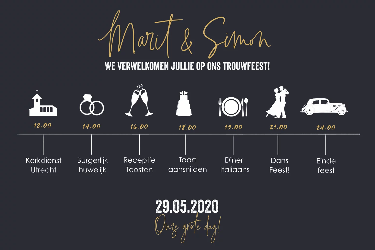 Trouwkaart met mooi geïllustreerde tijdlijn. De icoontjes geven de planning van jullie bijzondere dag weer. Door de donkere achtergrond komen de kleine tekeningetjes en de goudkleurige letters mooi uit de kaart. Leuk met een gouden envelop en bijpassende sluitzegel.