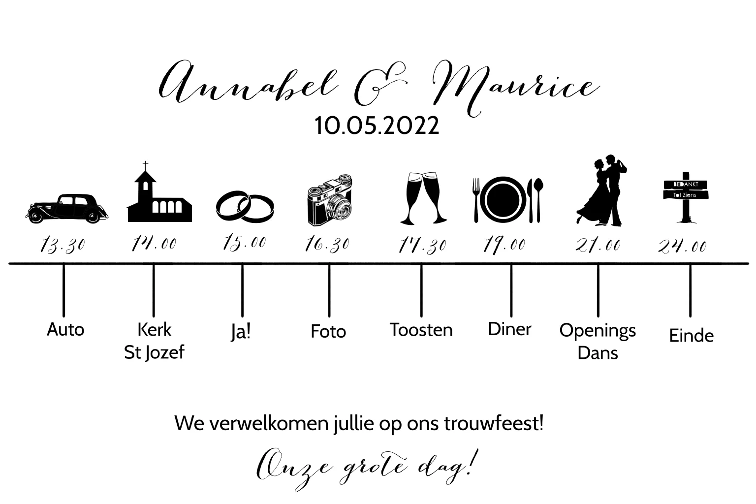 Hippe tijdlijn trouwkaart met icoontjes en teksten.