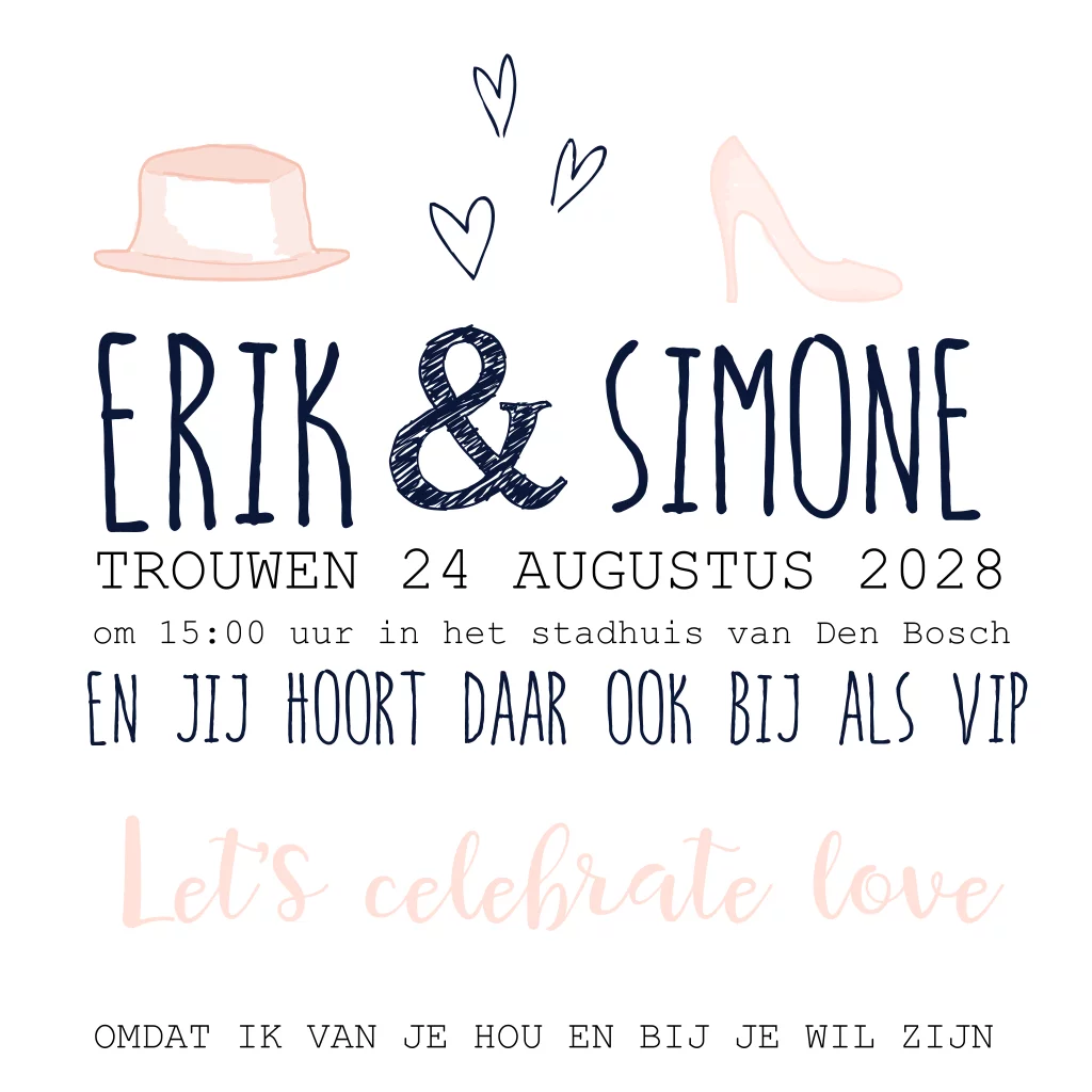 Trouwkaart met veel verschillende vrolijke lettertypes. Met illustraties van een hoed, hakschoen, taart en hartjes. Kies voor een bijpassende oud roze envelop.