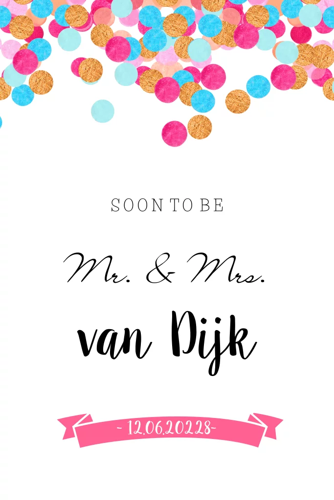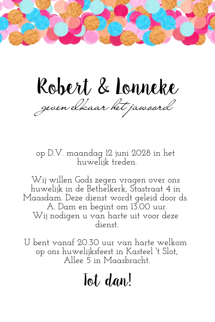 Deze feestelijke en vrolijke confetti trouwkaart, is een al een feestje op zich om te versturen. Nodig al jullie vrienden en familie uit met deze kleurrijke kaart. Gaaf met een bijpassende kleur envelop!