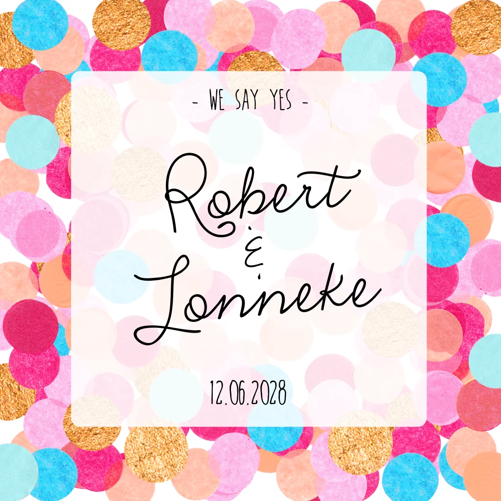 Deze feestelijke en kleurrijke confetti trouwkaart, is een al een feestje op zich om te versturen. Nodig al jullie vrienden en familie uit met deze leuke kaart. Gaaf met een bijpassende kleur envelop!