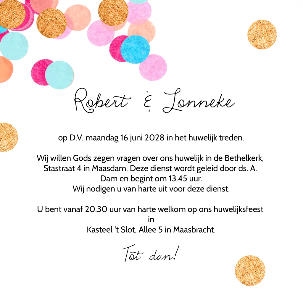 Feestelijke en kleurrijke confetti trouwkaart