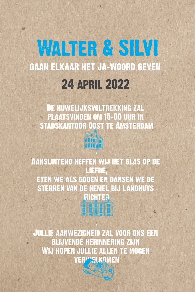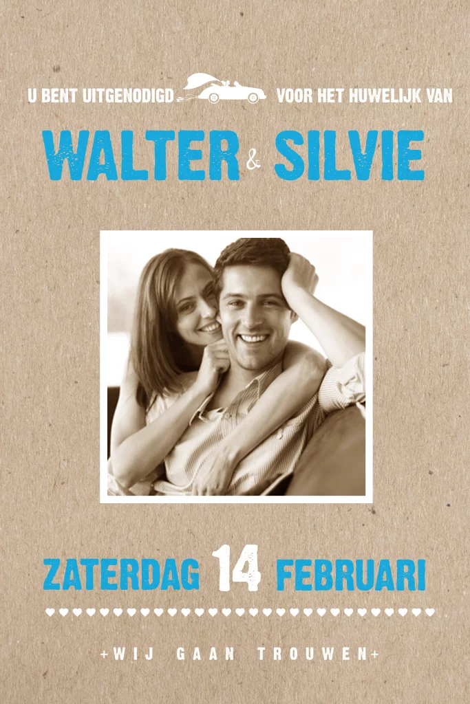 Uitnodiging voor een bruiloft met kraft en persoonlijke foto. Pas de kleur tekst en lay-out aan naar smaak! Extra feestelijk door een bijpassende kleur envelop te kiezen!