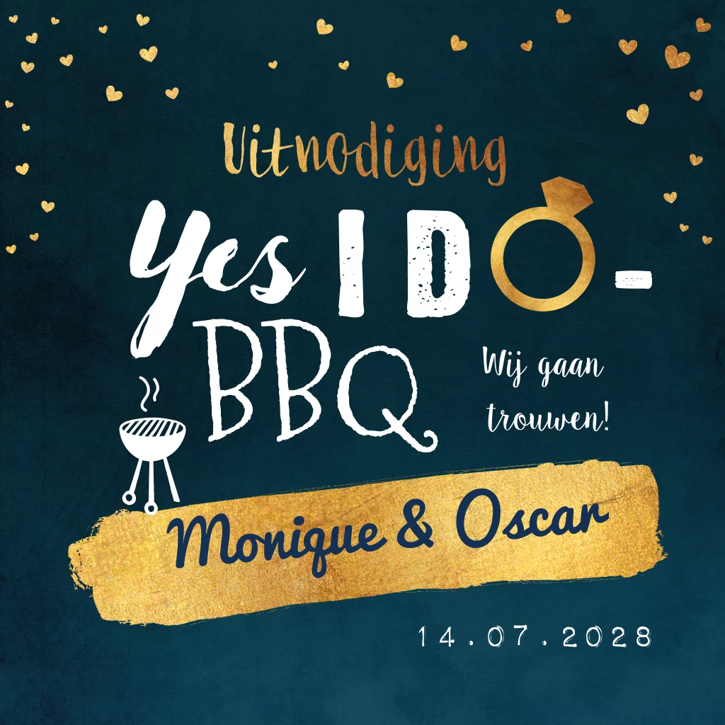 Trouwkaart met prachtige gouden accenten en sprankelende verlovingsring! Een feestelijke manier om al jullie dierbaren uit te nodigen! Verander de BBQ voor diner!