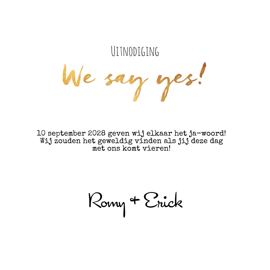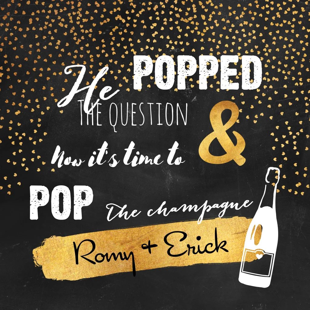 Trouwkaart met prachtige gouden confetti van hartjes en sprankelende champagne! Een feestelijke manier om al jullie dierbaren uit te nodigen! Let's pop that champagne!