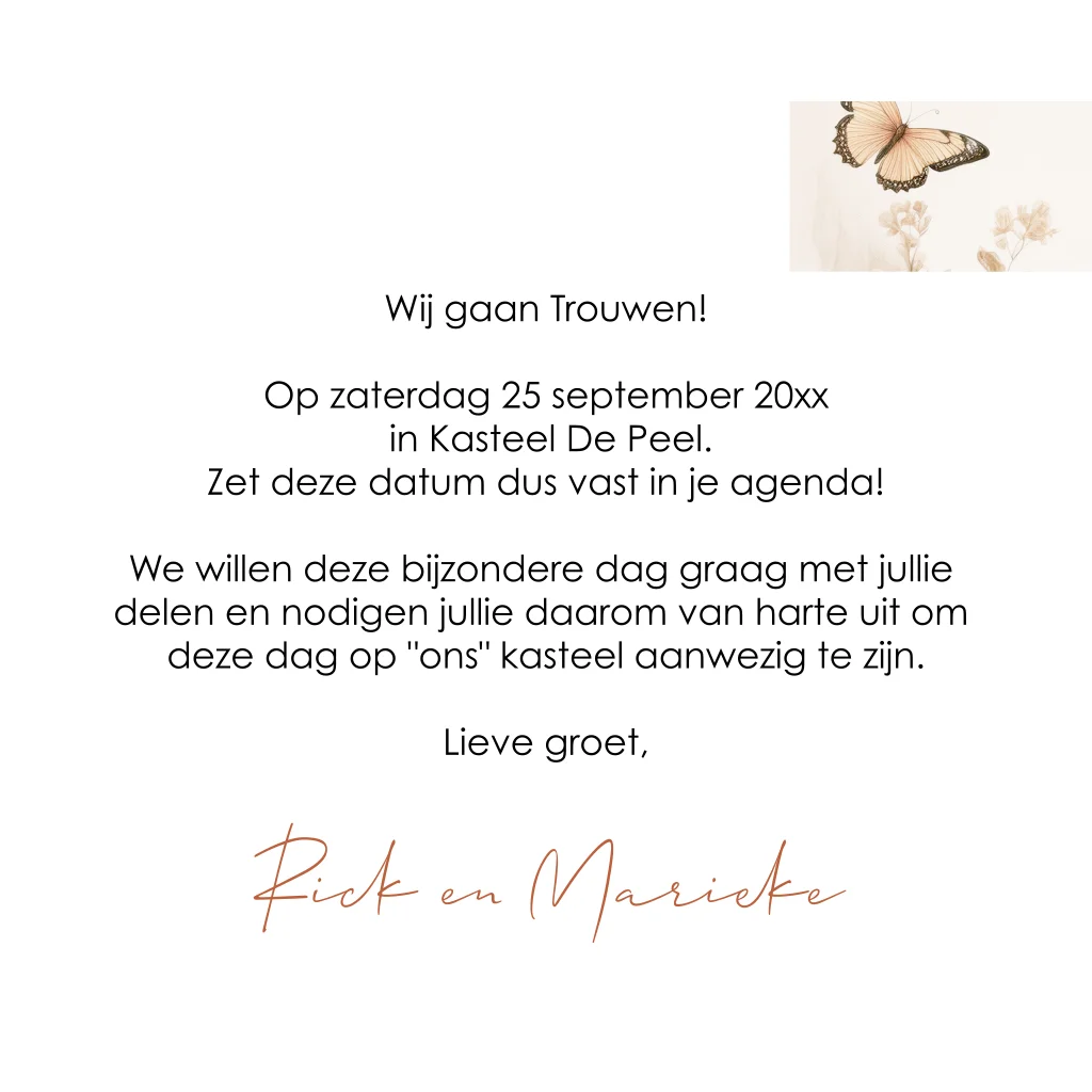 Een vrolijke trouwkaart met wilde bloemen en vlinders voor bijv. een trouwerij in de natuur.