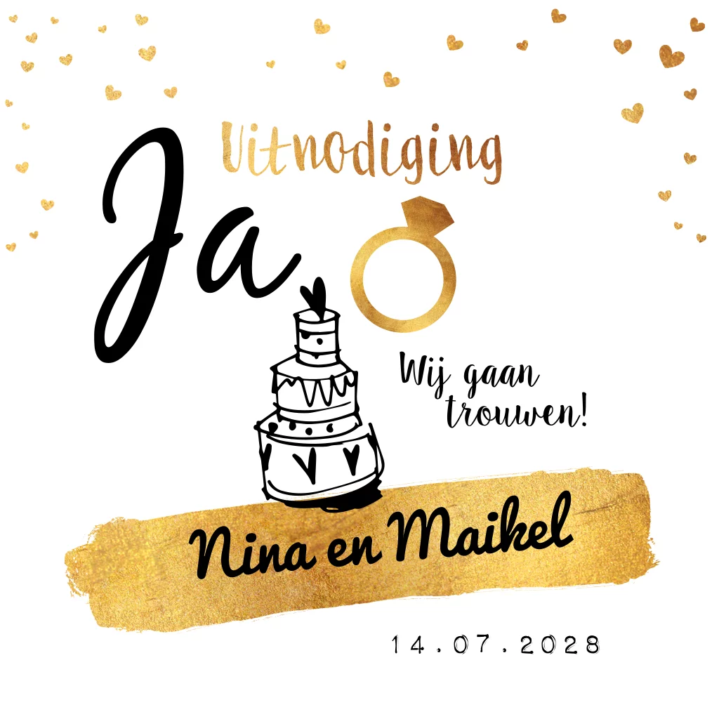 Alles draait om liefde! Vrolijke romantische witte trouwkaart met gouden hartjes, trouwring en taart. Nodig al jullie vrienden en familie uit met deze feestelijke trouwkaart. Mooi met een gouden envelop om het helemaal af te maken!