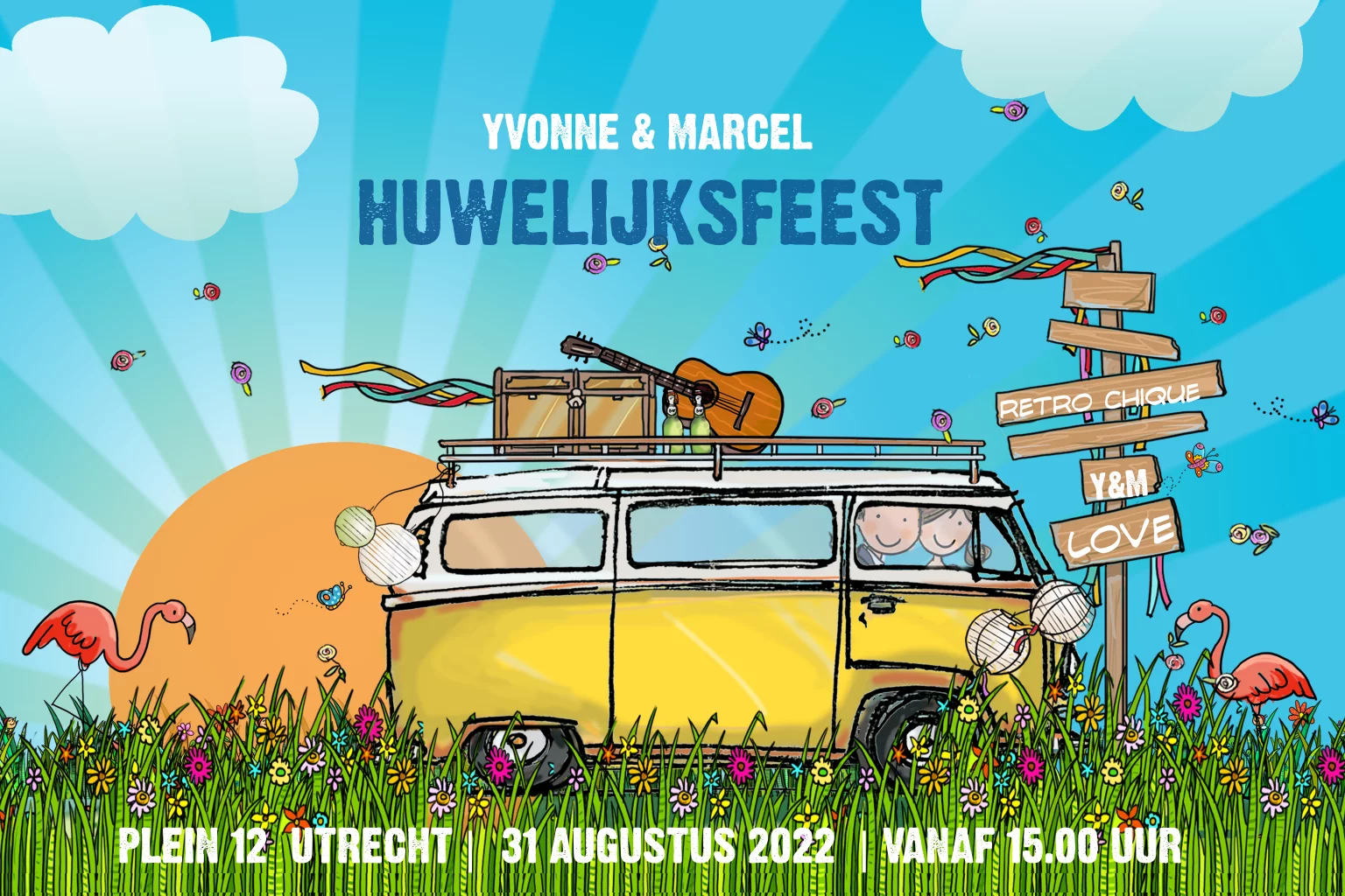 Eindelijk een originele hippe trouwkaart van een stoere vw bus met zonnestralen, tekst is aanpasbaar. Veel plezier ermee.