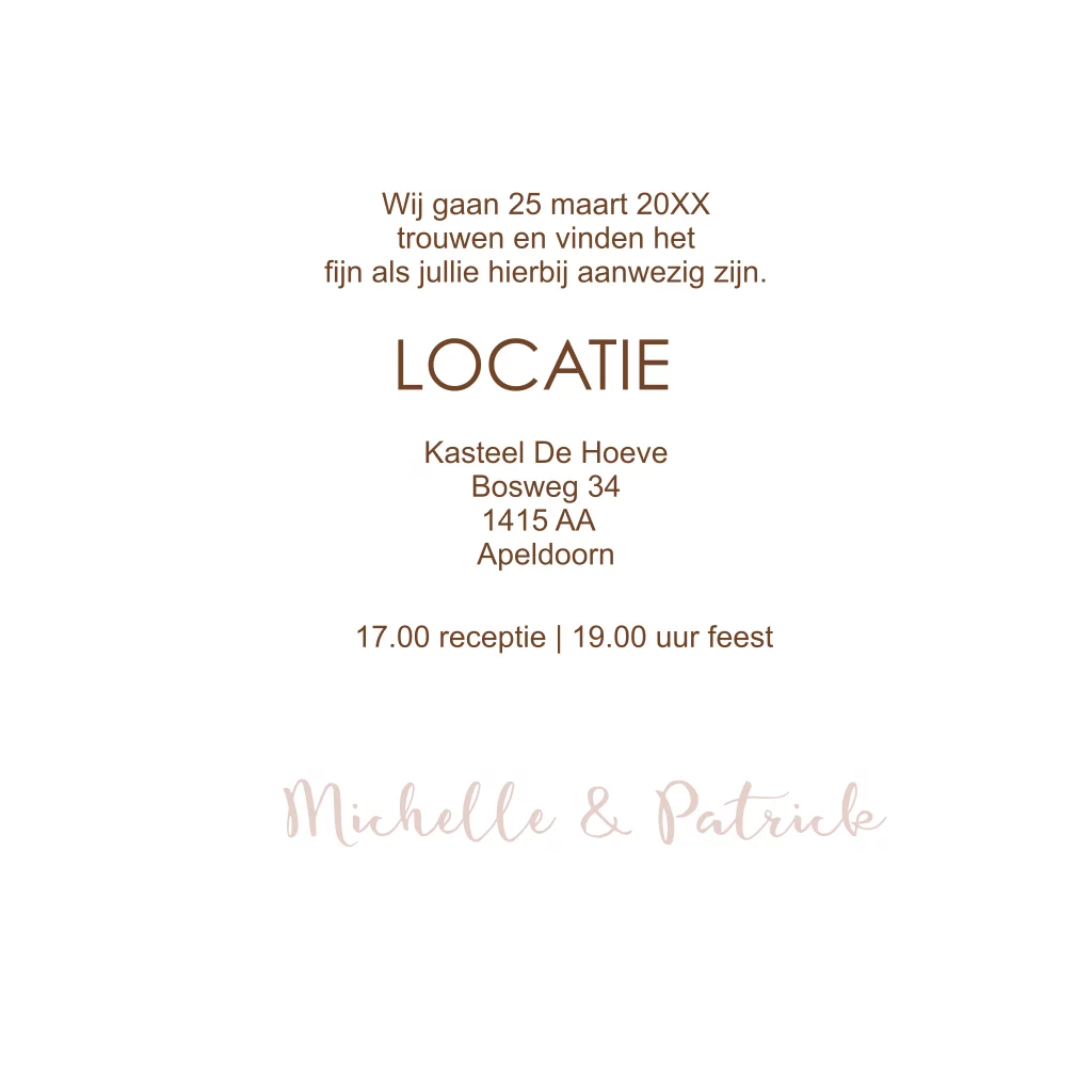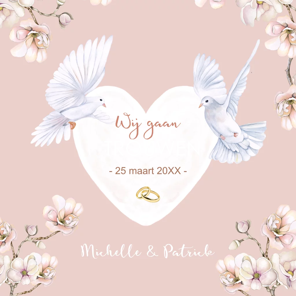 Romantische trouwuitnodiging met prachtige witte duiven, gepresenteerd op een hart versierd met botanische bloesemtakken.