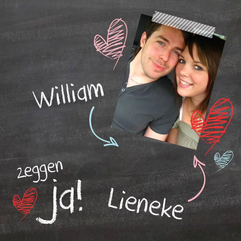Gaaf ontwerp voor jullie bruiloft uitnodiging. Plaats een mooie foto van jullie samen op de voorkant met schoolbord achtergrond en laat hiermee iedereen weten wanneer jullie bruiloft is!