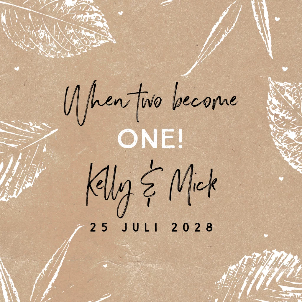 When two become one! Trouwbord met kraftlook, veel vrolijke lettertypes, kleine hartjes en romantische witte bladeren. Pas de tekst makkelijk naar wens aan. Met hippe kraftpapier look.