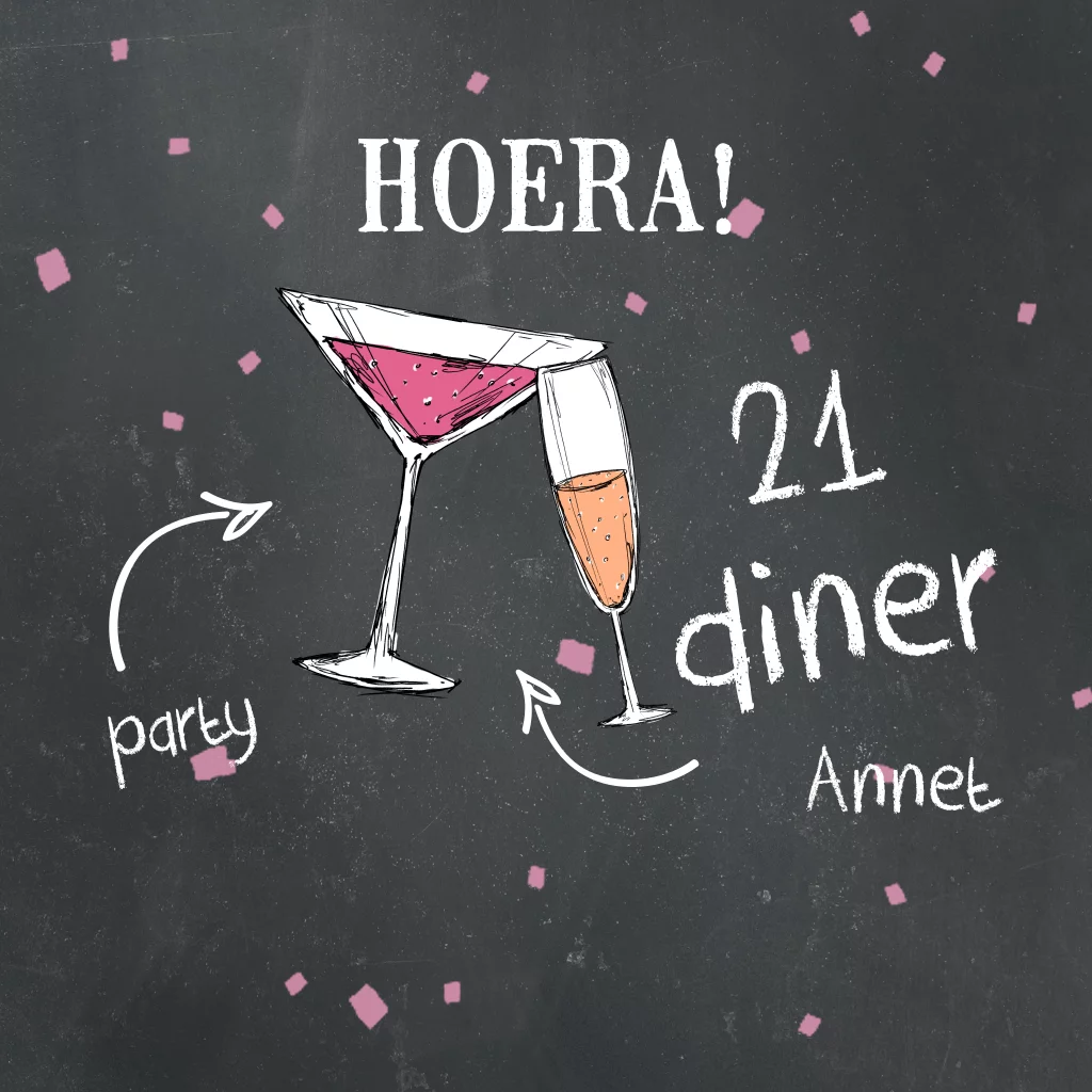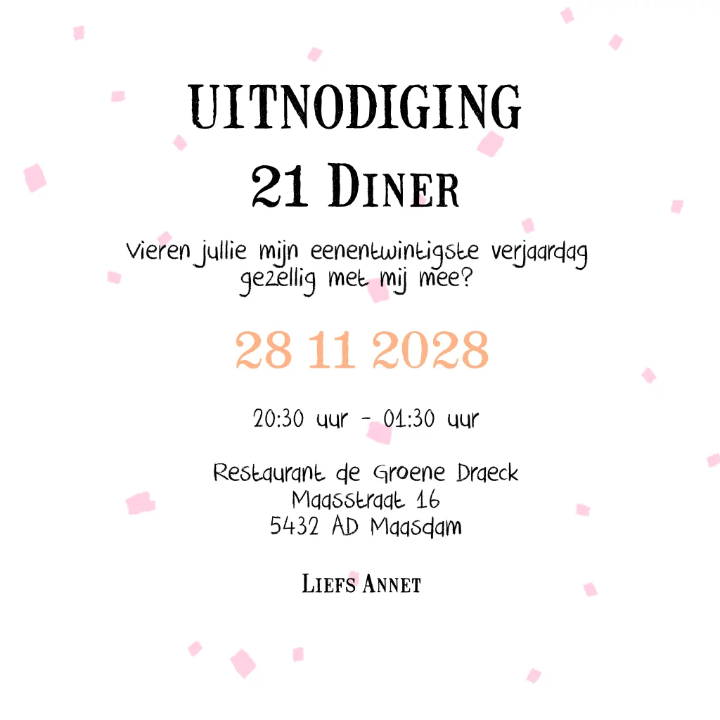 Leuke uitnodigingskaart voor diner ter ere van je eenentwintigste verjaardag! Tekst en confetti is aanpasbaar.