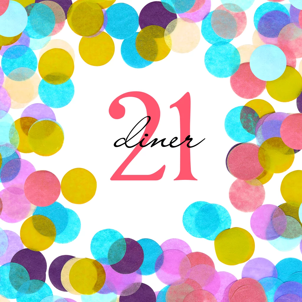 Vrolijke uitnodigingskaart voor diner ter ere van je eenentwintigste verjaardag! Tekst is aanpasbaar. Maak het af met een mooie bijpassende kleur envelop.
