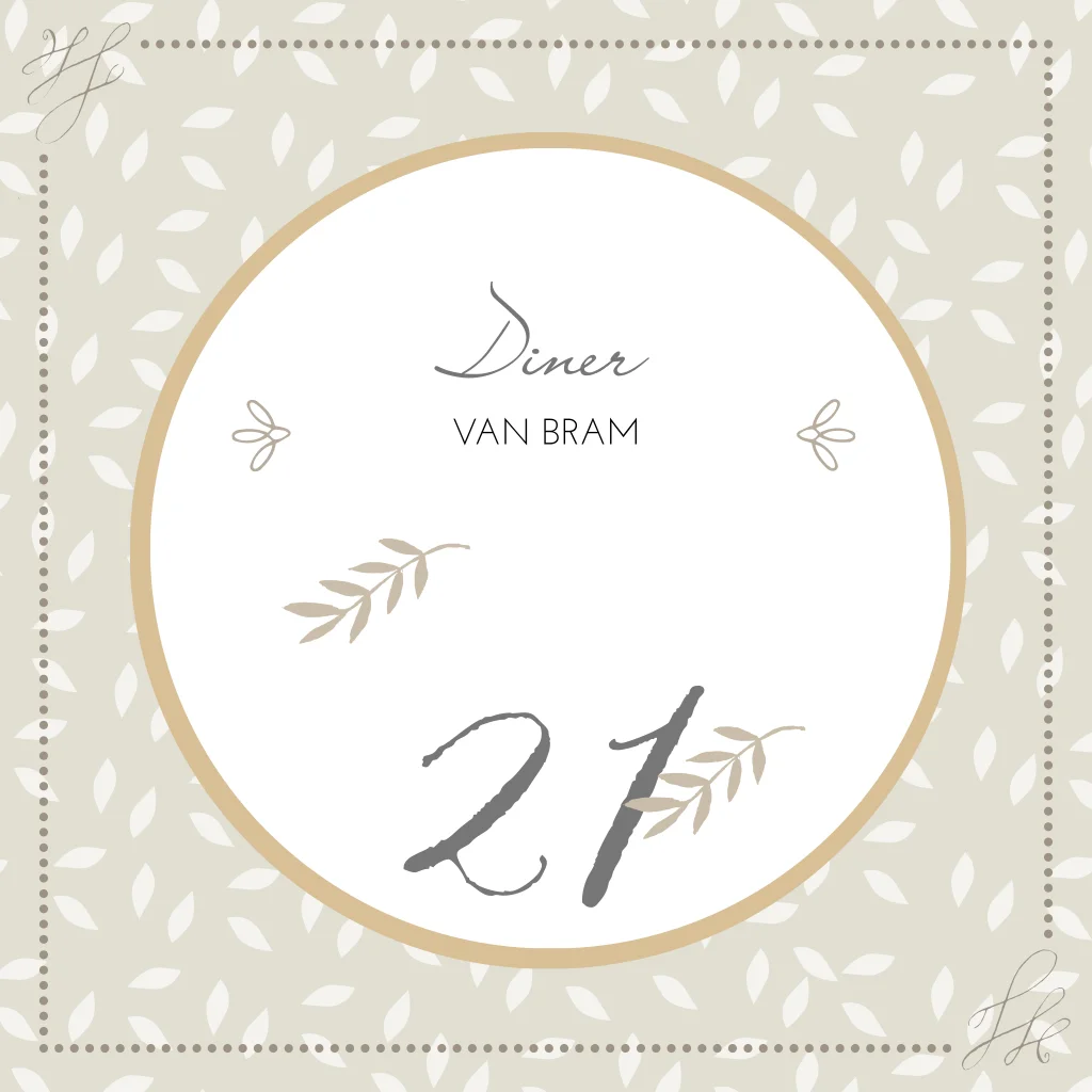Sierlijke kaart met rond kader, takjes en blaadjes voor jouw gezellige 21 diner! Mooi ook met een bijpassende kleur envelop.
