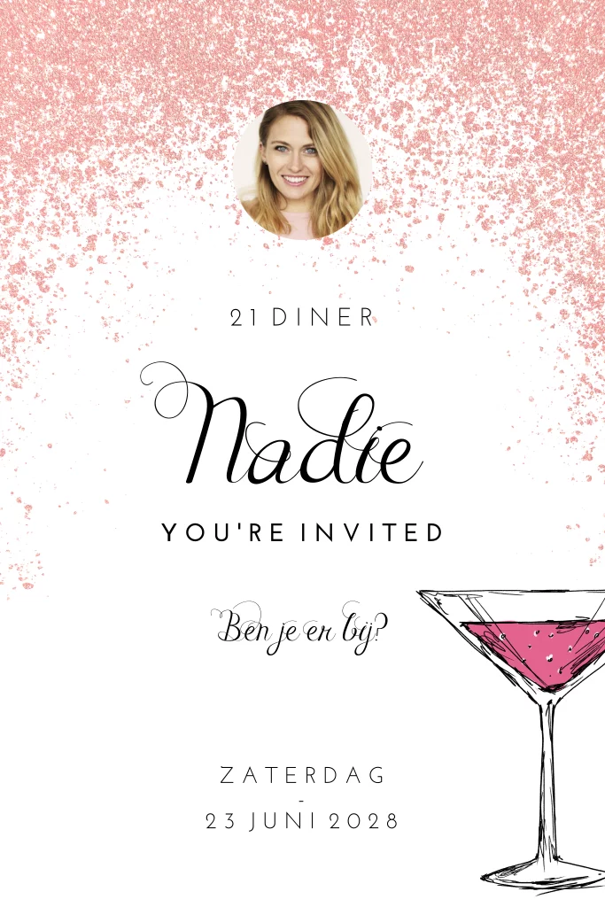 Uitnodiging voor een 21 diner met roze glitter regen, ruimte voor een foto en versierd met een lekker cocktail. De tekst op de kaart is aanpasbaar naar een eigenlijk. Tip! Druk deze kaart af op parelmoer papier, dat geeft een mooi glansje!