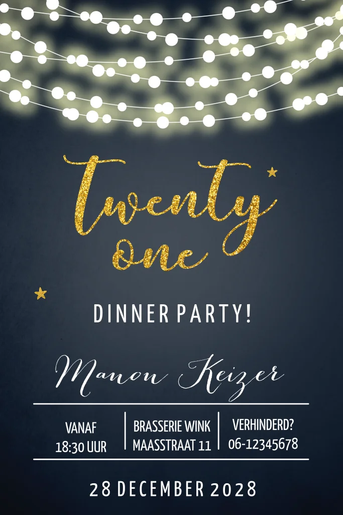 Stijlvolle uitnodiging voor jouw 21 diner. Feestelijk door de gouden glitter letters en lichtjes slingers. Maak het af met een gouden envelop.