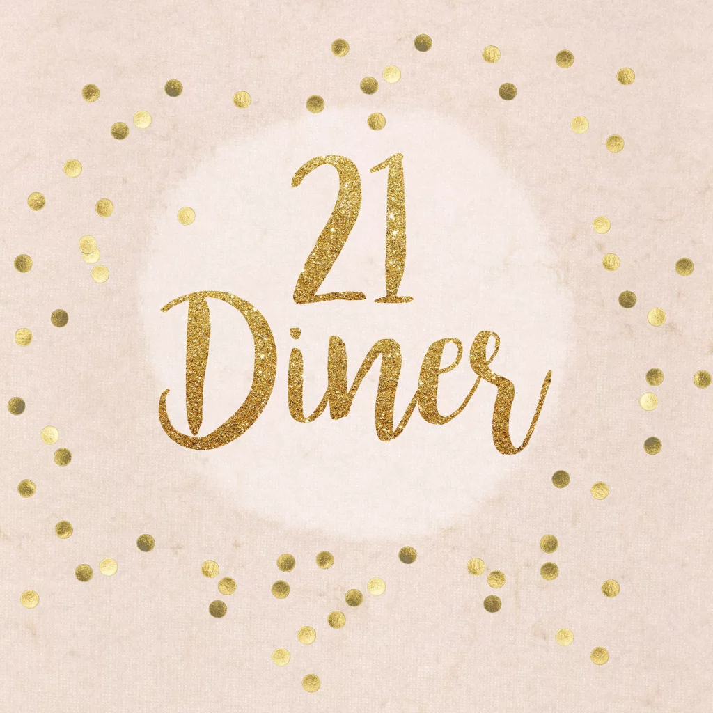 Feestelijke uitnodiging voor je 21 diner. Vrolijk design met gouden confetti en oud roze marmer achtergrond. Pas de tekst op de achtergrond geheel naar wens aan. Leuk met een gouden envelop en bijpassende sluitzegel.
