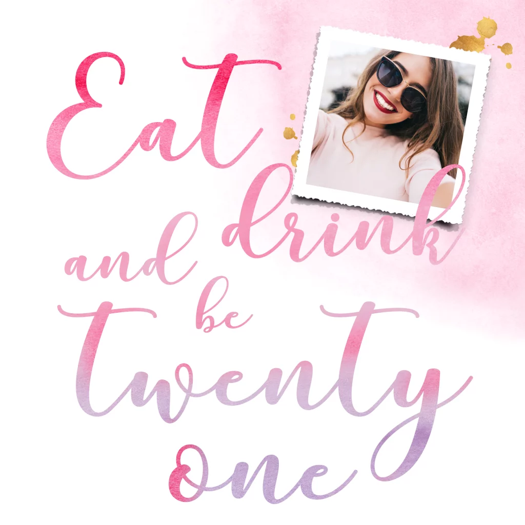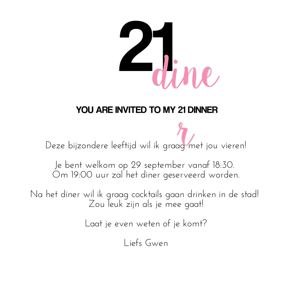Vrolijke uitnodiging voor een 21 diner met roze sierlijke letters en ruimte voor een eigen foto. Aan binnenkant leuke gouden elementjes. Gaaf met een bijpassende roze of gouden envelop!