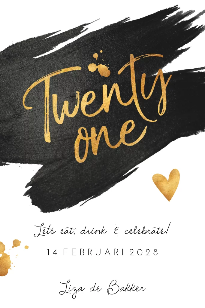 Stijlvolle uitnodiging voor jouw 21 diner! Sierlijk met zwarte verf veeg en gouden letters en hartjes. Past er mooi bij een gouden envelop. Maak het helemaal af met een van onze toffe sluitzegels.