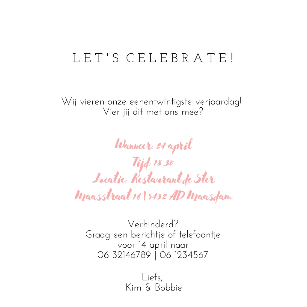 Uitnodiging 21 diner met foto strip en roze cijfer ballon