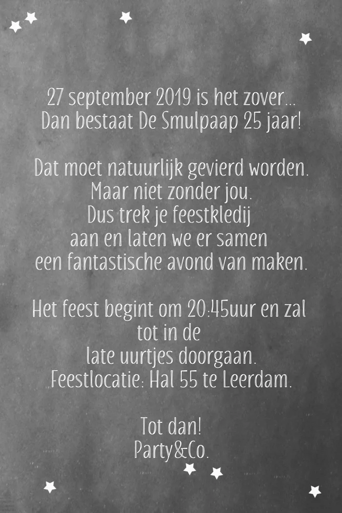 Een vrolijke uitnodiging voor een bedrijfsfeest, personeelsfeest, werkjubileum of teamuitje. Met een wegwijzer op een grijze achtergrond en versierd met witte sterren. Pas de tekst geheel naar wens aan. Leuk met een bijpassende kleur envelop.