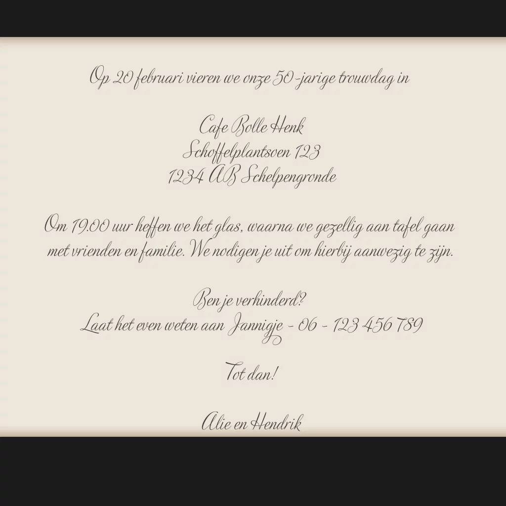 Zijn jouw woorden ook van goud? Stuur dan deze bijzondere uitnodiging om de gasten van jouw feest uit te nodigen. Tip: Bestel deze kaart op parelmoerpapier. De gouden kleuren in deze kaart komen dan het beste tot zijn recht.