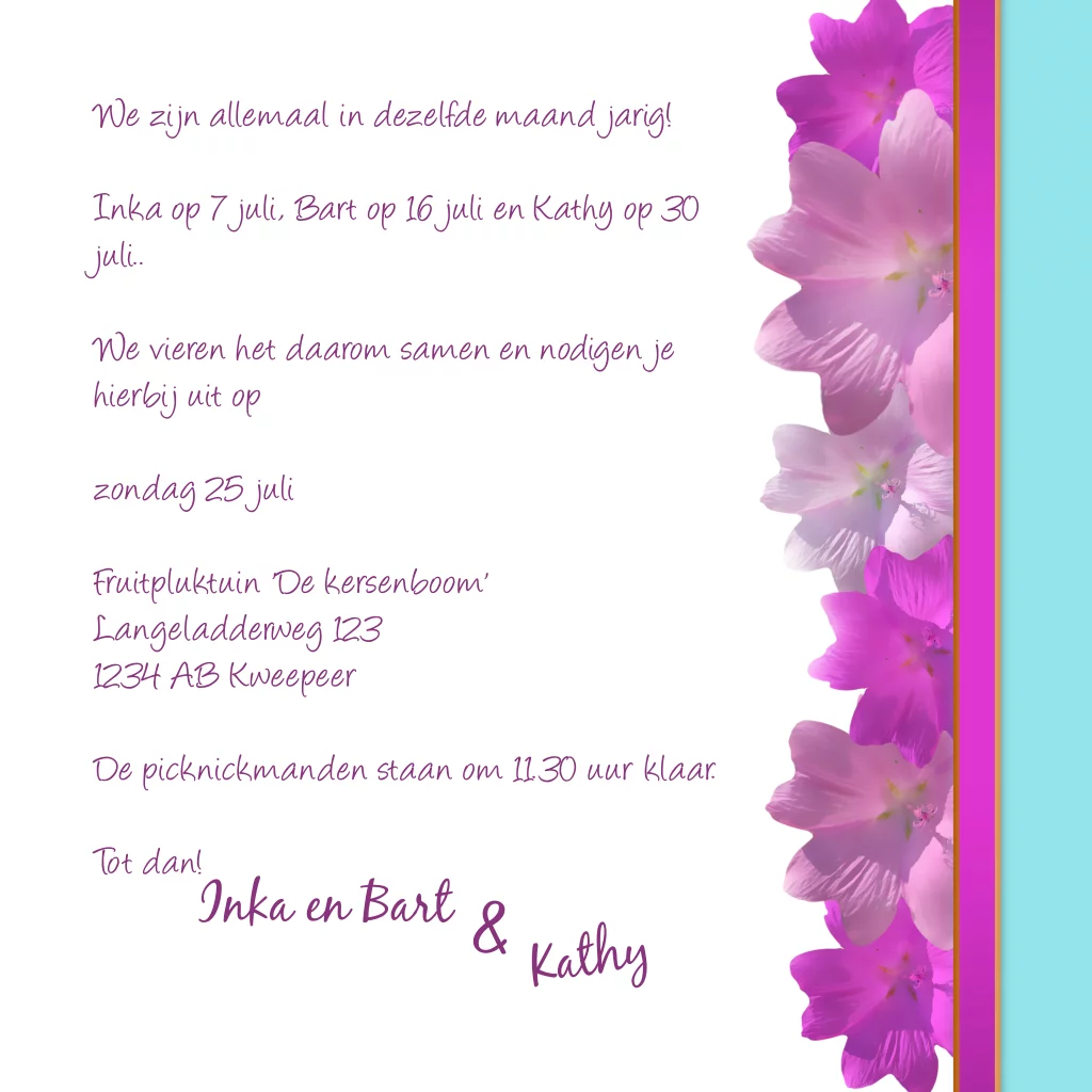 Vier je je verjaardag met een leuke activiteit zoals een picknick? Laat iedereen het weten en stuur deze vrolijke uitnodiging! De foto en alle teksten zijn te veranderen.
