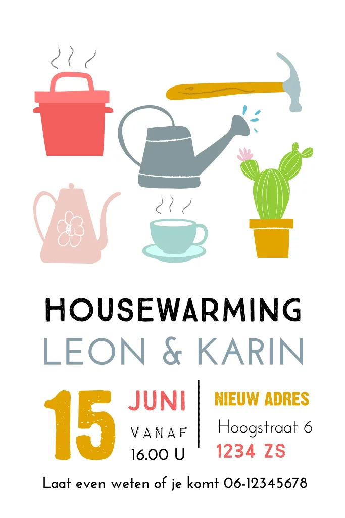Vrolijke kleurrijke uitnodiging voor een housewarming. Leuk geïllustreerd met o.a. een gieter, hamer, cactus en theekopje. Tof om te kiezen voor een kleur envelop die bij deze uitnodiging past.