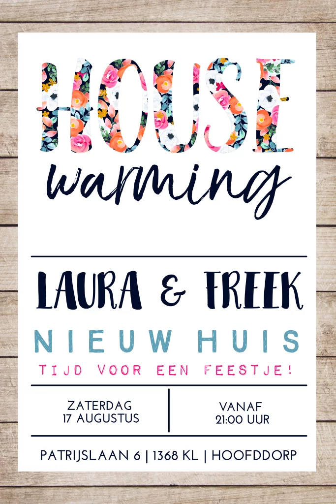 Vrolijke uitnodiging voor een housewarming. Leuke houten achtergrond met bloemen letters. Pas de tekst aan, kies voor een gewenst lettertype en een bijpassende kleur envelop.