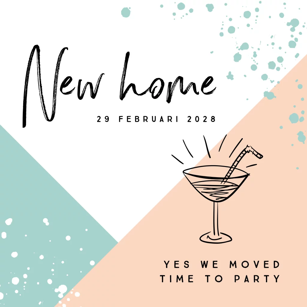 Vrolijke uitnodiging met verfspetters voor een housewarming. De cocktail spat van de kaart door de zalmroze achtergrond. Samenwonen wordt nog leuker door het versturen van deze kaart. Tip! Kies een envelopkleur die past bij een van de kleuren uit de kaart.