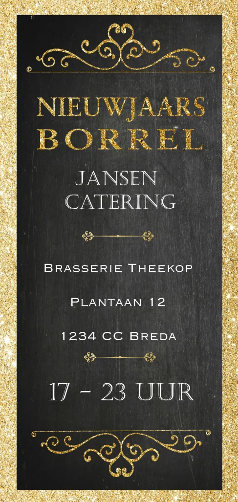 Nodig met deze feestelijke nieuwjaarsborrel uitnodiging al uw werknemers uit. Met gouden glitter letters en krijtbord achtergrond. Pas de tekst naar wens aan. Met een gouden envelop en bijpassende sluitzegel maak je deze uitnodiging helemaal af!