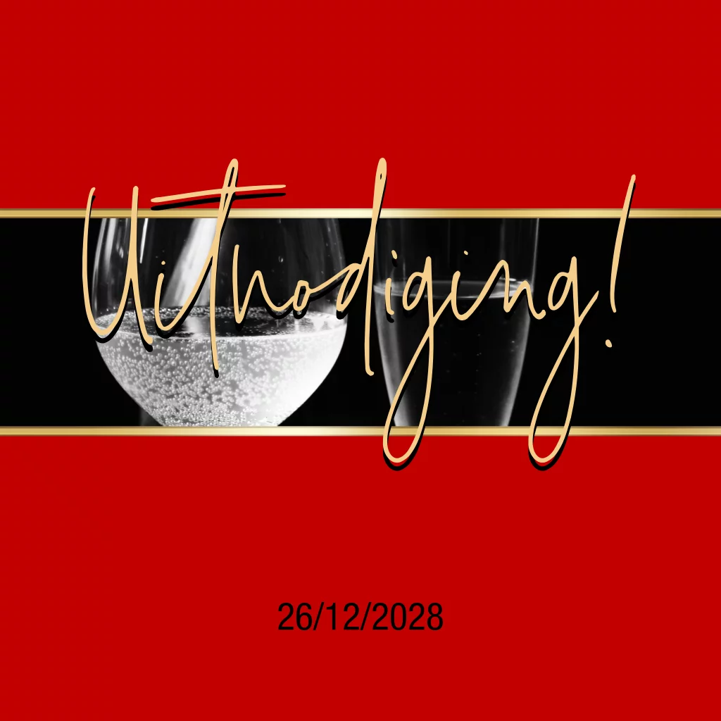 Een stijlvol kaartje met bubbels in een wijnglas en gouden banden.
