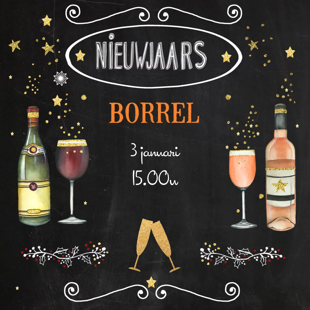 Uitnodiging voor een Nieuwjaarsborrel met collega's. Wijn en rosé op krijtbord achtergrond. Leuk versierd met feestelijke goudkleurige sterren en glitter champagne glazen. Maak het af met een bijpassende kleur envelop en sluitzegel. Gelukkig nieuwjaar!